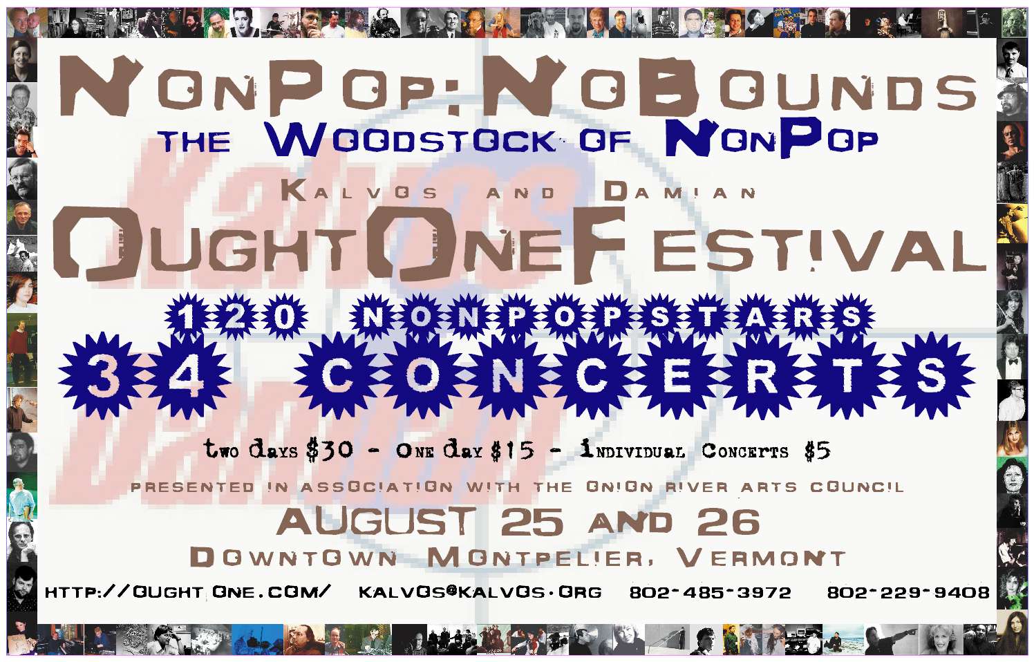 The Ought-One Festival was produced (through chutzpah and hubris) by Kalvos & Damian and its own sponsoring organizations (the Onion River Arts Council, the Vermont Contemporary Music Ensemble, the Consortium of Vermont Composers, and Malted/Media). Coordination of grants, activities, and funding was done in several cities. The key organizer in New York City, and a driving force behind The Ought-One Festival, was composer Phil Kline. The Festival is ultimately made possible by the composers and performers themselves. Among financial sponsors: