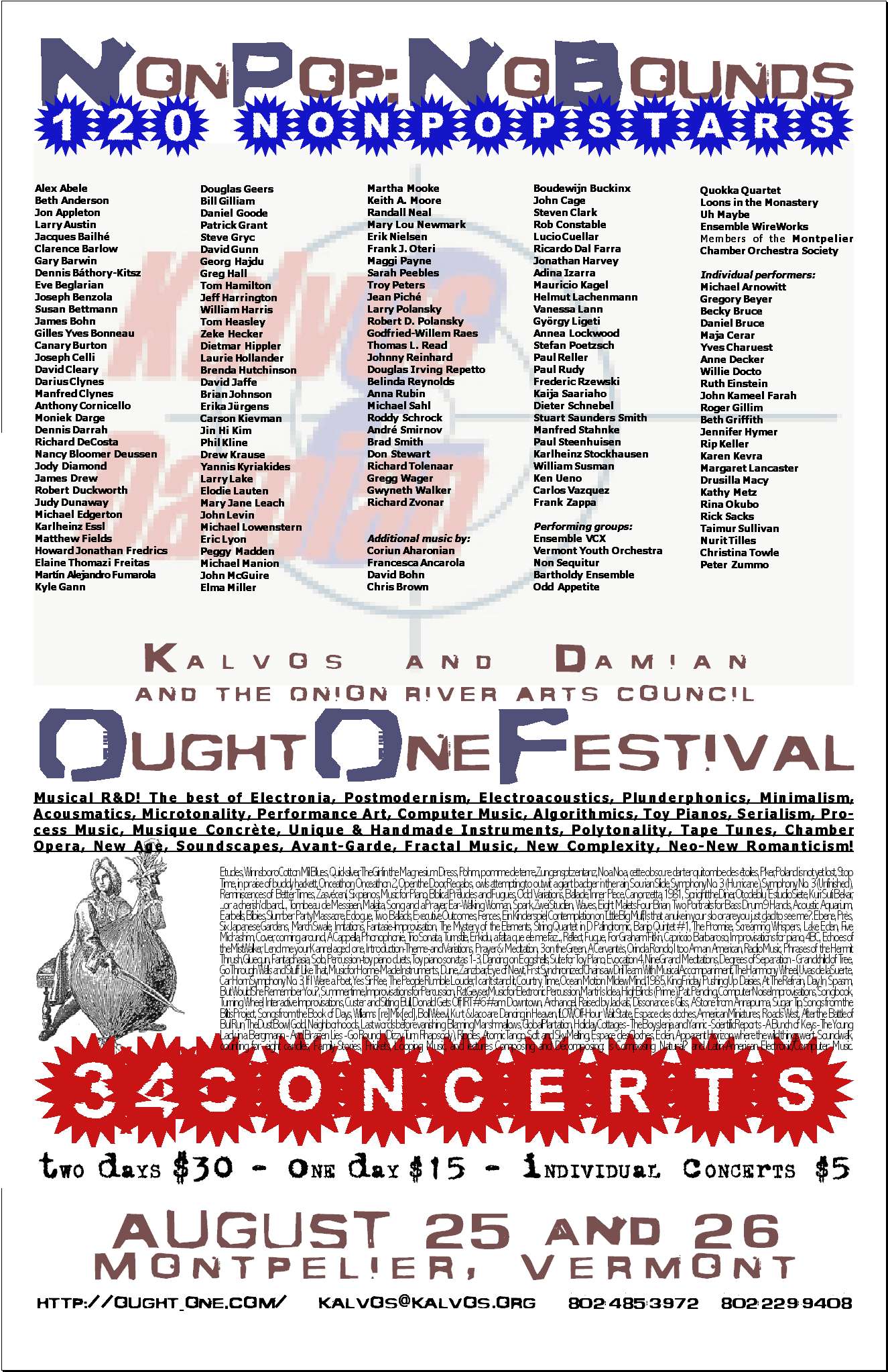 The Ought-One Festival took place on Saturday and Sunday, August 25-26, 2001, in downtown Montpelier, Vermont, America's smallest state capital. In four downtown spaces, the Festival presented nearly 40 concerts of NonPop.