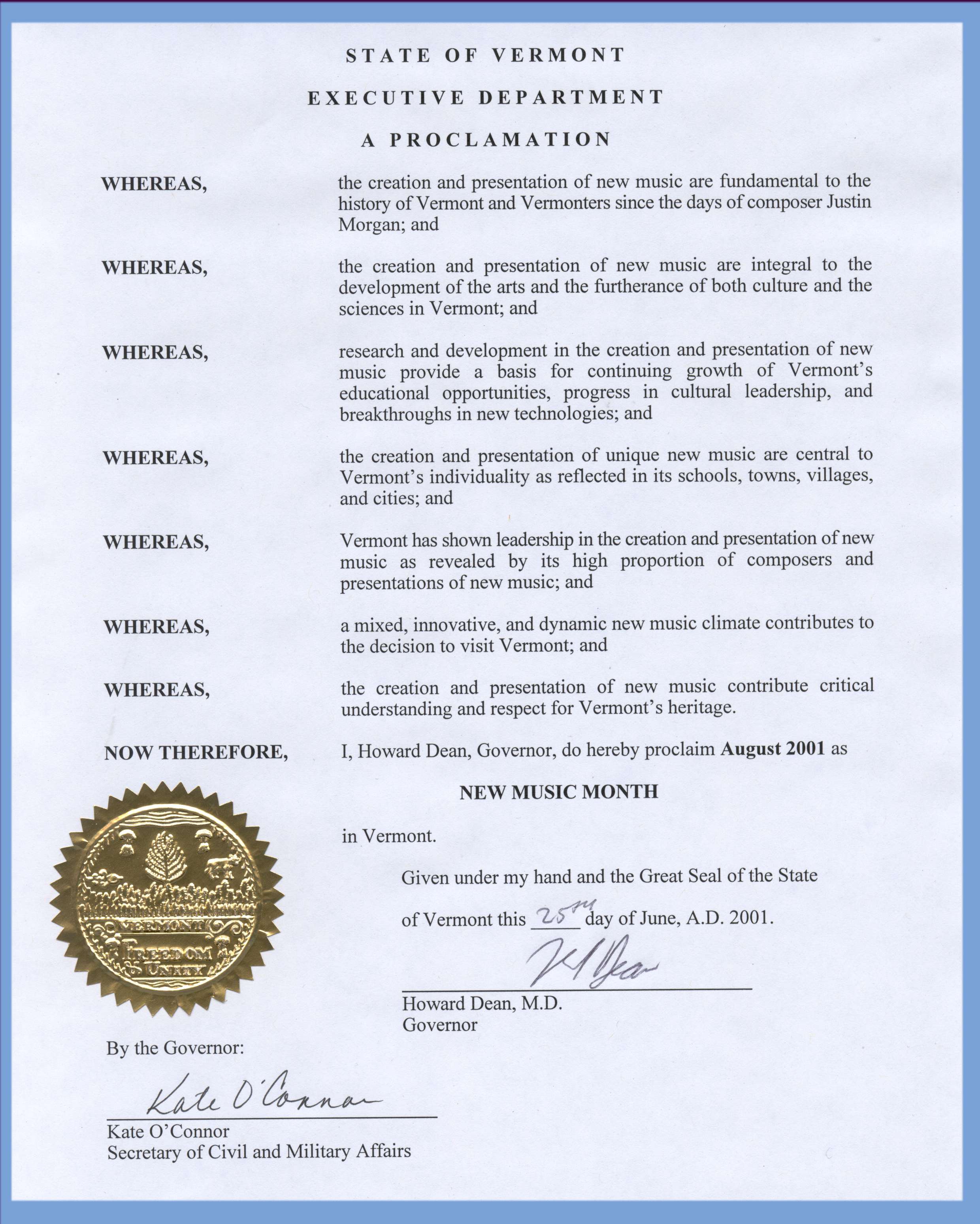 Click to see large JPEG; right-click to download. (520K) Click to read the text of Governor Howard Dean's proclamation |